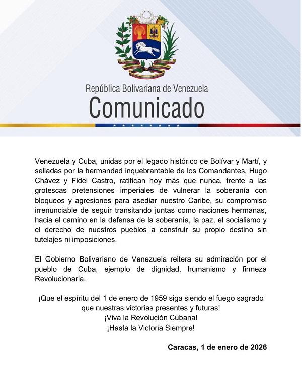 La República Bolivariana de Venezuela reitera en este día de celebración su solidaridad y fraternidad con la hermana Cuba, celebrando seis décadas y siete años de resistencia, dignidad y conquistas populares.