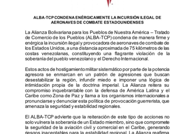 LEER MÁSLa Alianza Bolivariana para los Pueblos de Nuestra América – Tratado de Comercio de los Pueblos (ALBA-TCP) expresó su más firme condena…