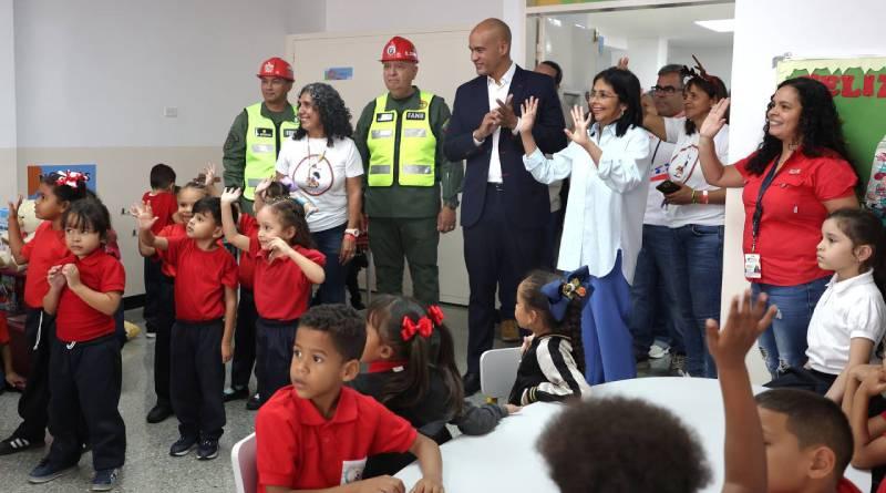 La vicepresidenta Ejecutiva de la República Bolivariana de Venezuela, Delcy Rodríguez, y el ministro del Poder Popular para la Educación, Héctor Rodríguez, reinauguraron este martes el Centro de Educación Inicial “Cecilia Pimentel”, en Caracas. En ese espacio, la vicepresidenta afirmó que no han podido con Venezuela, “no podrán con sus maestras y maestros, con la familia que se ve integrada en este centro de educación”.