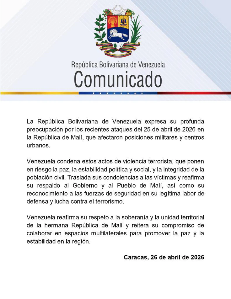 El Gobierno de la República Bolivariana de Venezuela emitió un comunicado oficial para expresar su profunda preocupación ante los ataques registrados el pasado 25 de abril de 2026 en la República de Malí, los cuales afectaron diversas posiciones militares y centros urbanos del país africano.